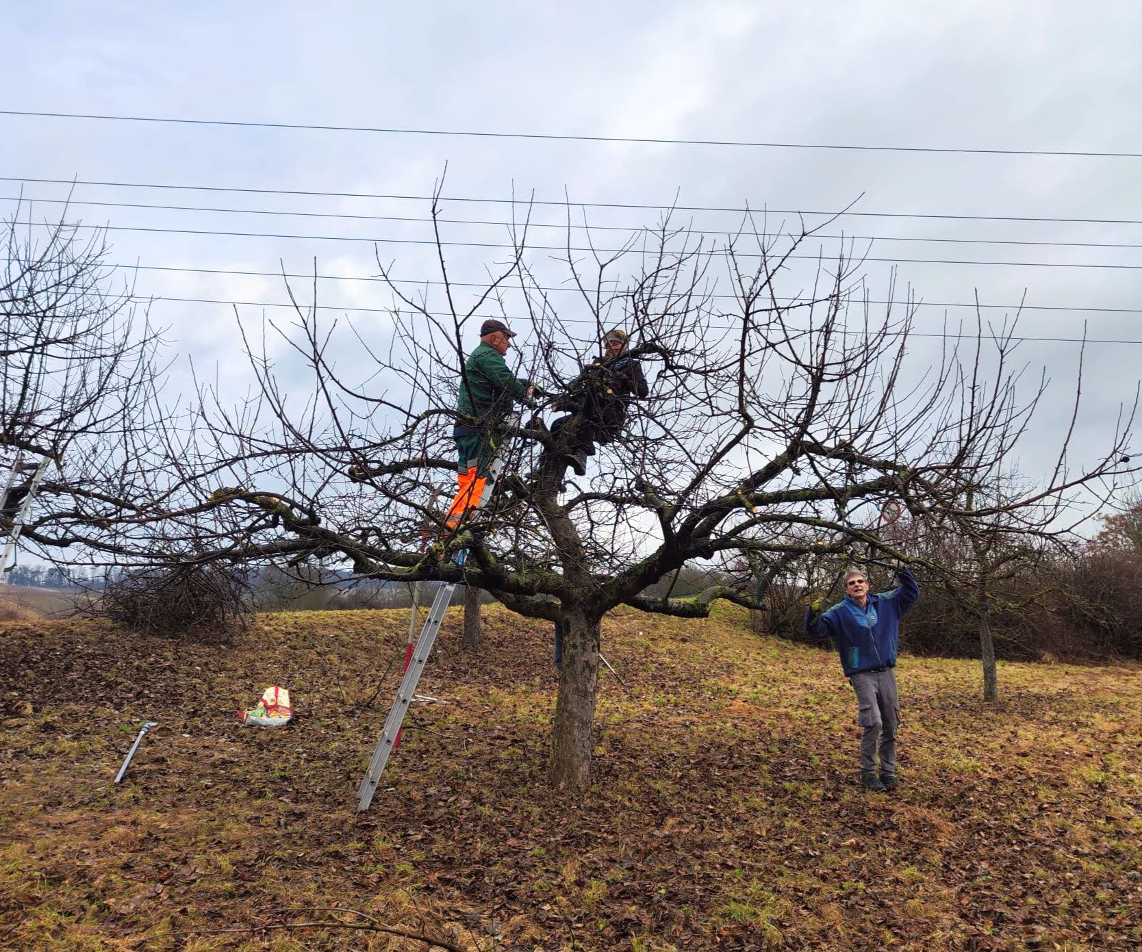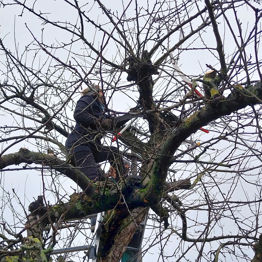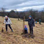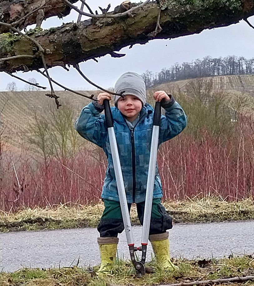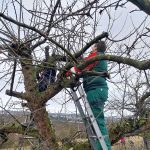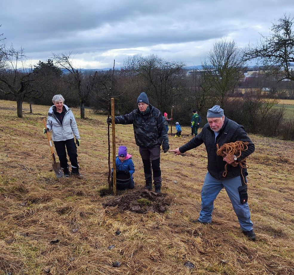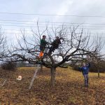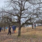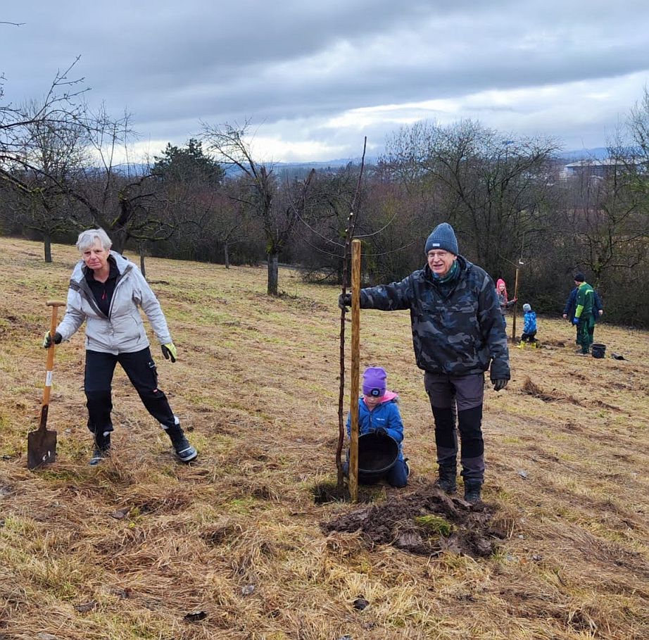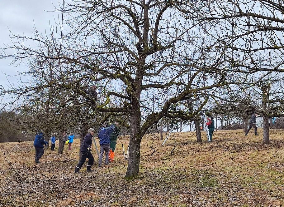 Dieses Jahr war die Altersspanne der Helfer von 6 bis 80 Jahren. In einer städtischen Streuobstanlage wurden unter Anleitung von Fachleuten aus der Stadtgärtnerei, NABU und SAV über 40 Streuobstbäume fachgerecht geschnitten und das Reisig zum Abtransport an den Weg verbracht. Im Rahmen dieser Pflegemaßnahme wurden zusätzlich 8 weitere Hochstämme gepflanzt, gespendet vom Erlös des Kirschblütenfestes. Mit großem Elan konnten sich die Kinder beteiligen, sie schaufelten Pflanzerde in das Pflanzloch und traten die Erde mit schweren Stiefeln fest.