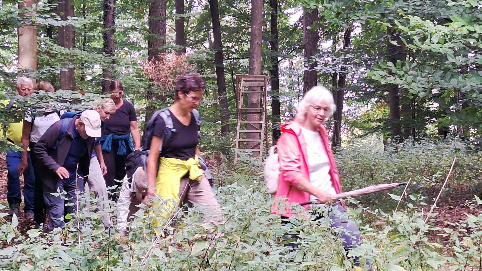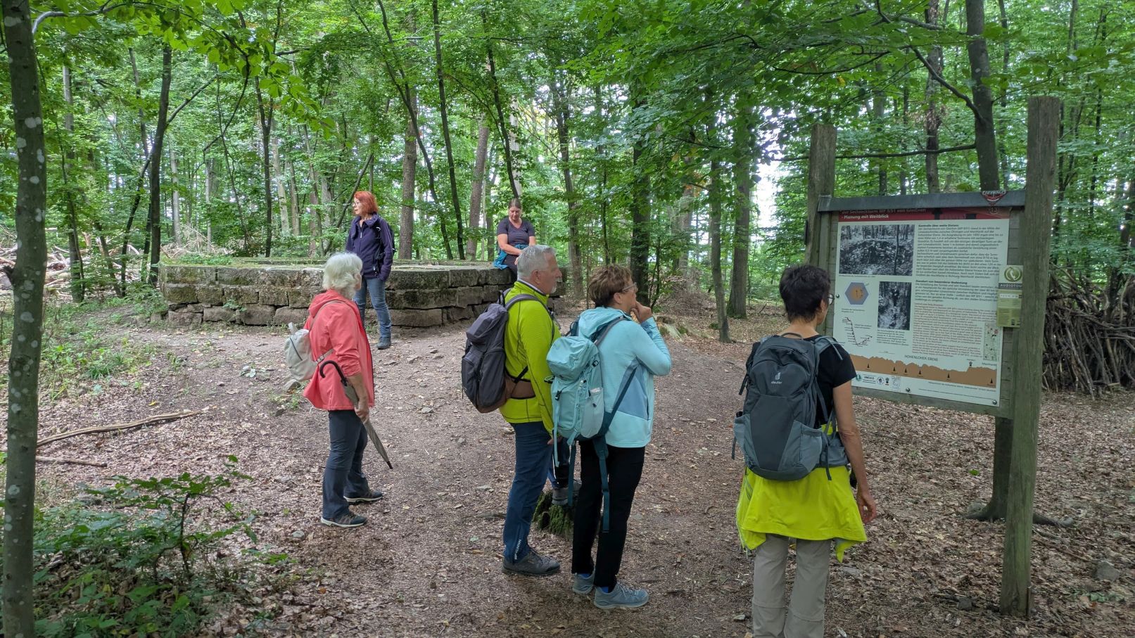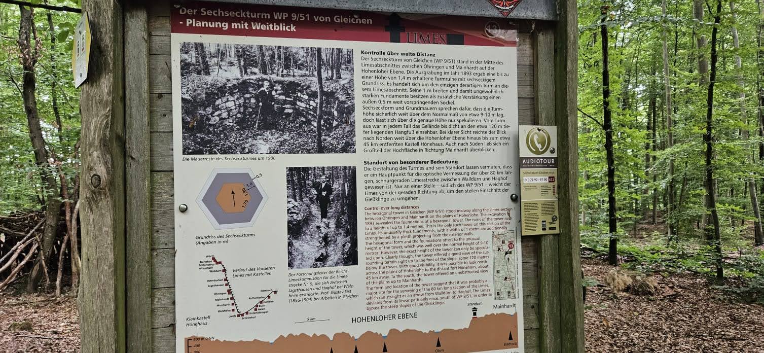 Von der Römerstraße in Gleichen starteten die Gäste auf dem Limesweg zum Sechseckturm, dem Wachturm 9/51, der unweit des Limesblicks liegt. Der Turm diente auch als Messpunkt, für die 80 km gerade Linie des Limes zwischen dem Haghof südlich von Welzheim und Walldürn.
