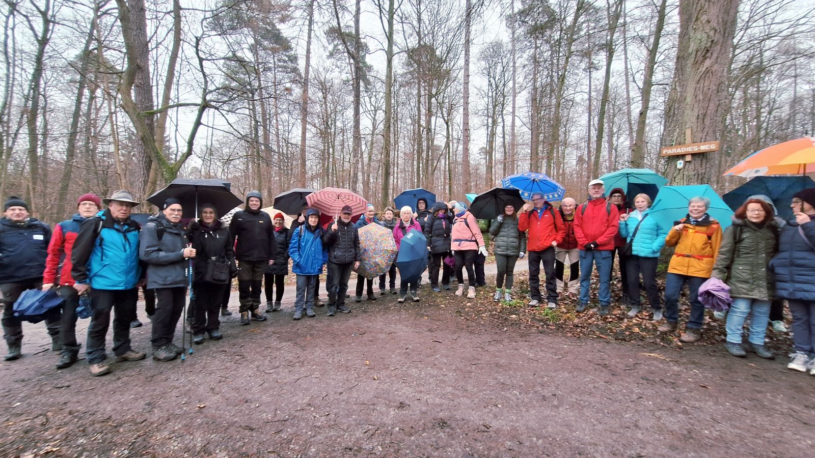 Der Strom der Autos auf den Parkplatz am Wanderheim wollte trotz des mäßigen Wetters gar nicht aufhören. Schließlich hatten sich 35 Gäste eingefunden, die sich gut gelaunt und beschirmt auf den Weg machten.