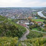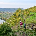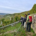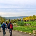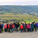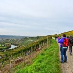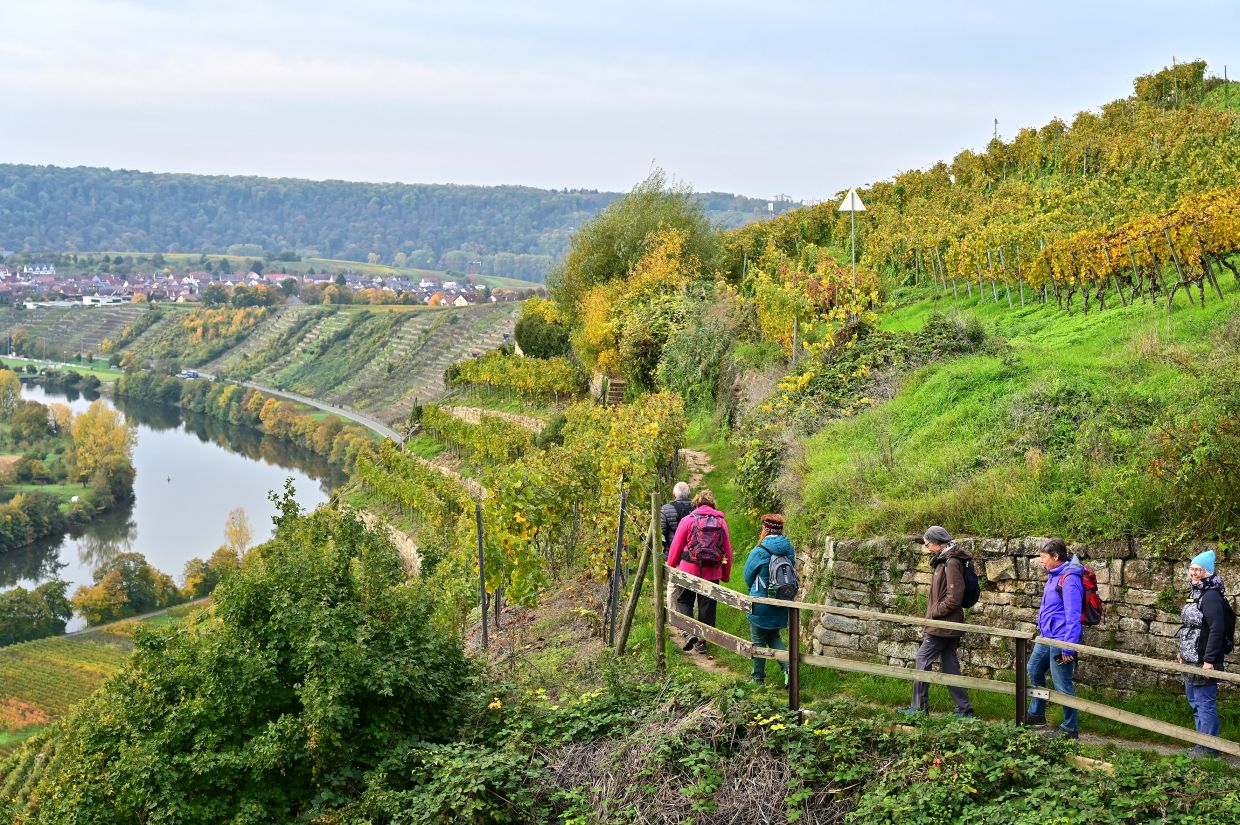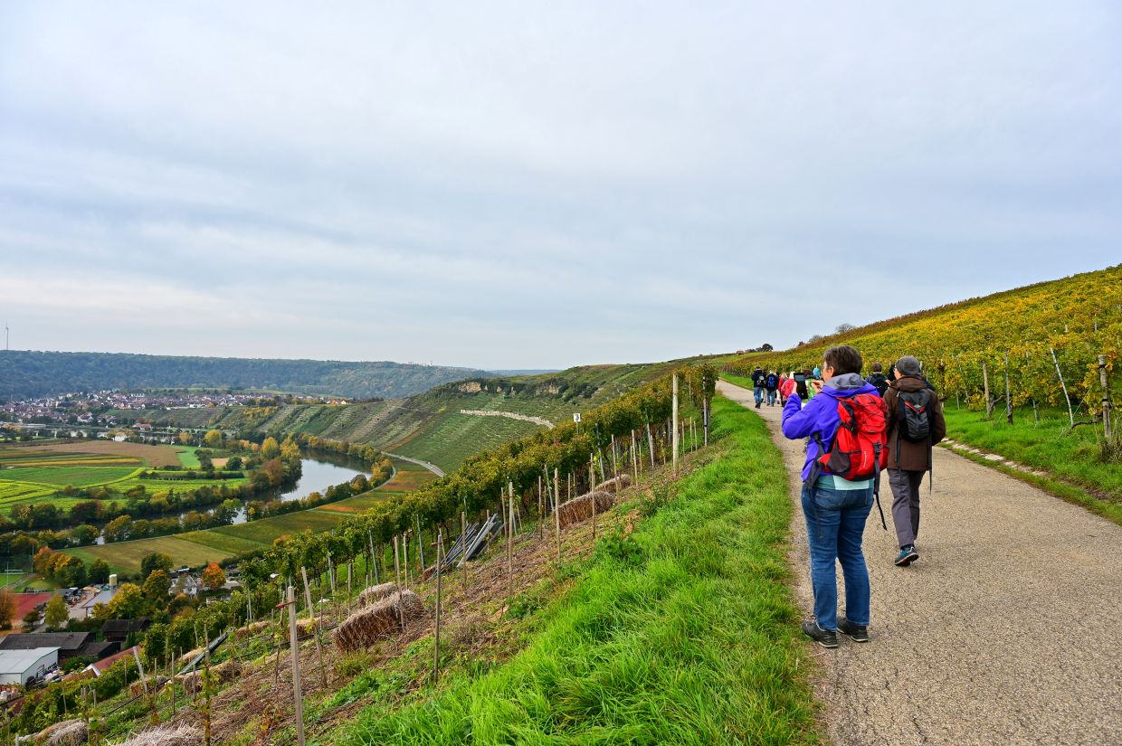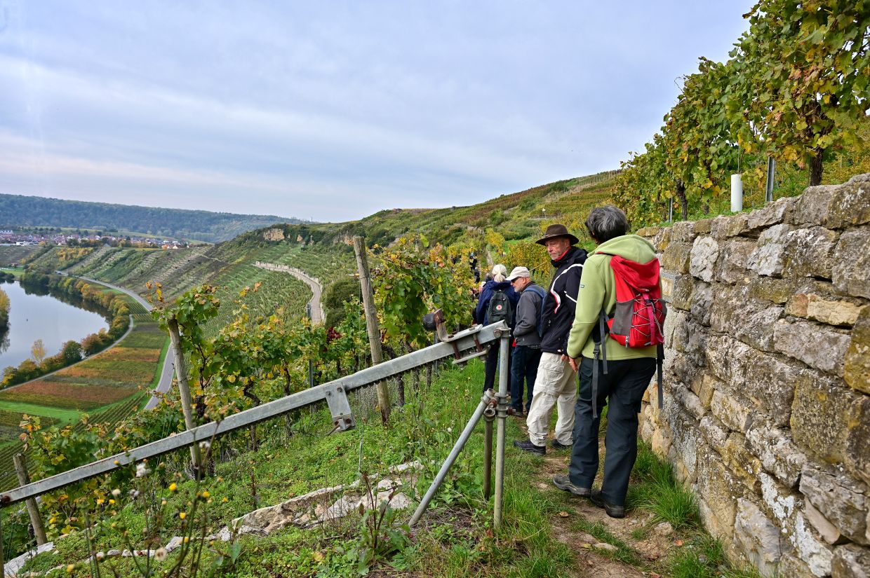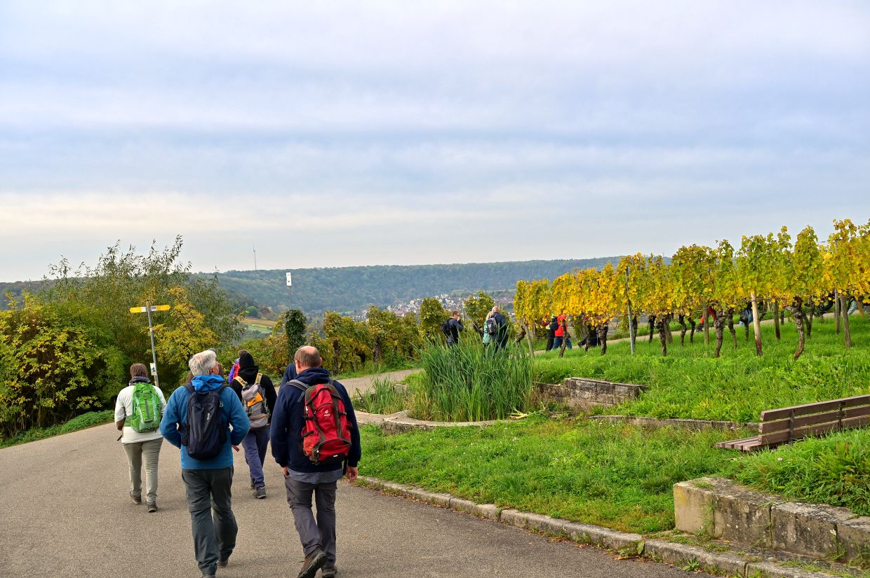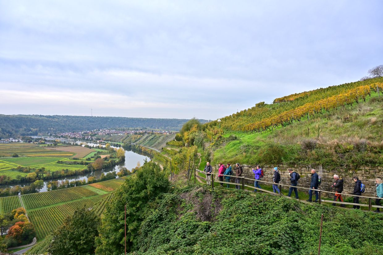 Los ging es vom Parkplatz an der L1115 in Richtung Mundelsheim. Schon nach kurzer Zeit konnte die Gruppe die herrliche Aussicht auf die Neckarschleife und die beeindruckenden Steillagen bestaunen. Hier haben Vollernter keine Chance. Auf schmalen Pfaden wanderte die Gruppe dann parallel zum Hang durch die Weinberge. Man kann nur erahnen, wie schwer die Arbeit hier ist und niemand wundert sich darüber, dass diese Lagen so nach und nach aufgegeben werden.