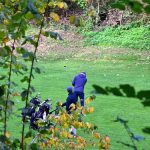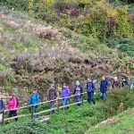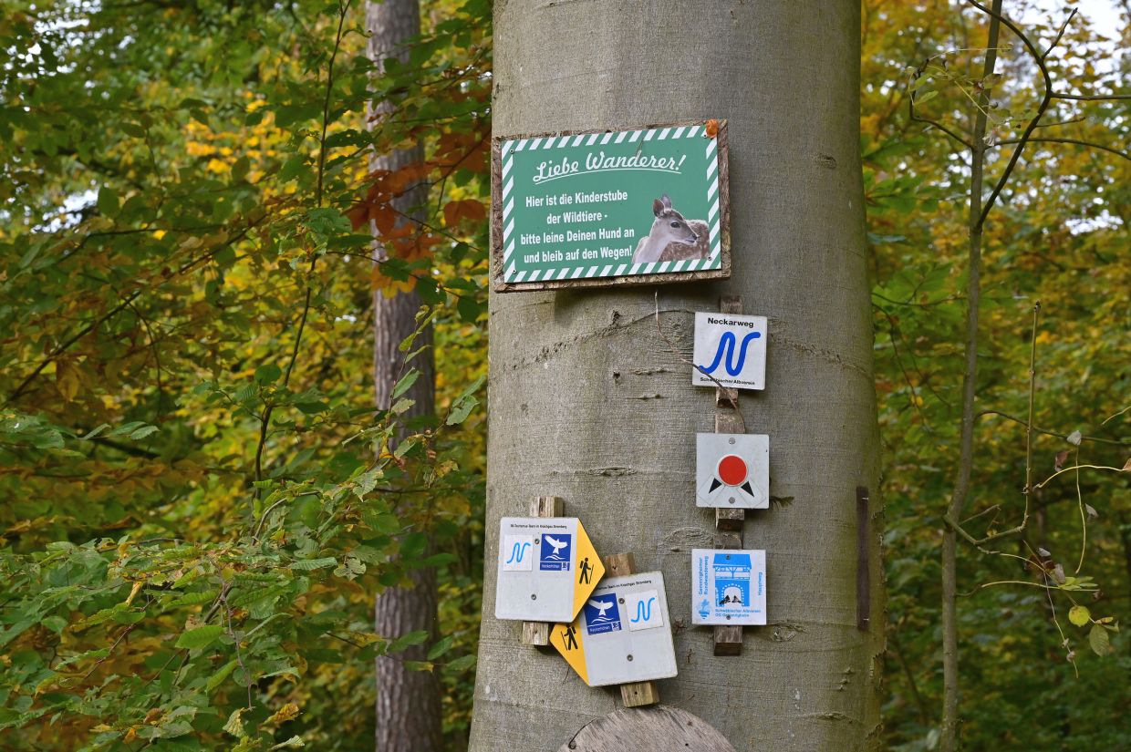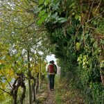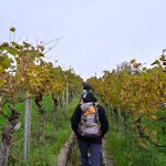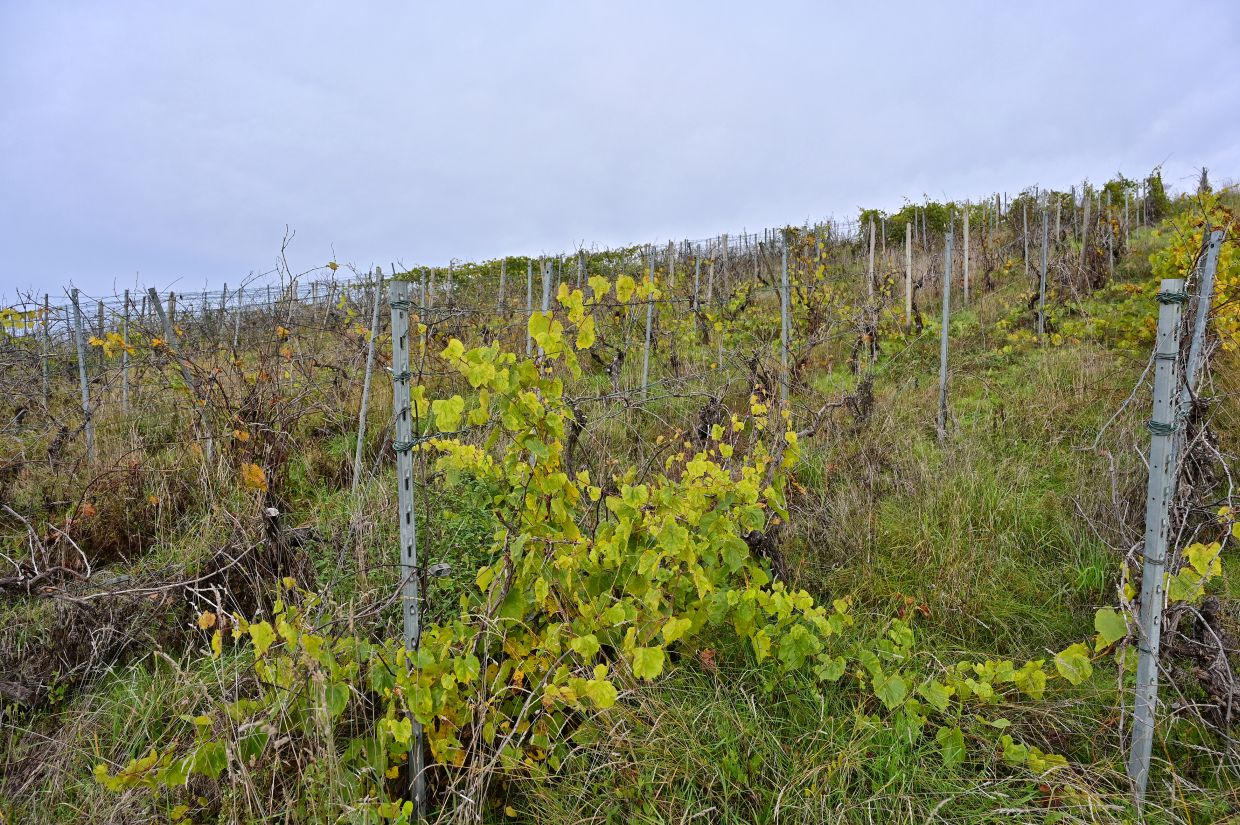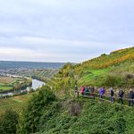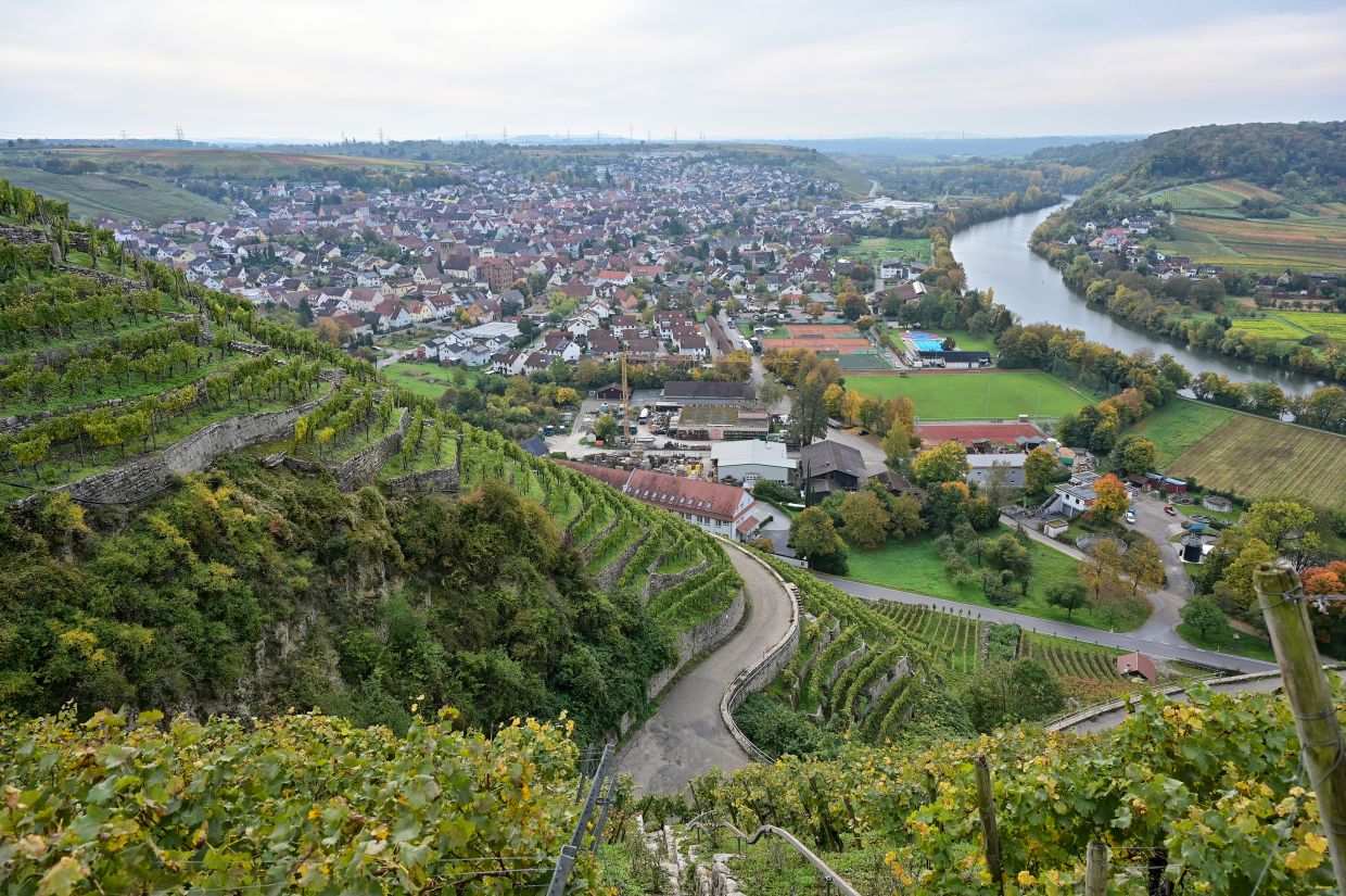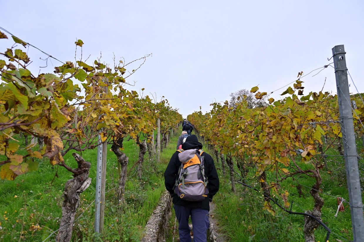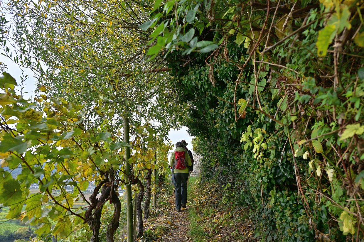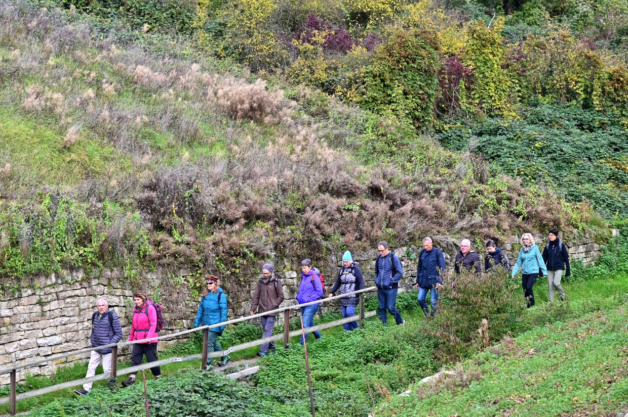 Los ging es vom Parkplatz an der L1115 in Richtung Mundelsheim. Schon nach kurzer Zeit konnte die Gruppe die herrliche Aussicht auf die Neckarschleife und die beeindruckenden Steillagen bestaunen. Hier haben Vollernter keine Chance. Auf schmalen Pfaden wanderte die Gruppe dann parallel zum Hang durch die Weinberge. Man kann nur erahnen, wie schwer die Arbeit hier ist und niemand wundert sich darüber, dass diese Lagen so nach und nach aufgegeben werden.