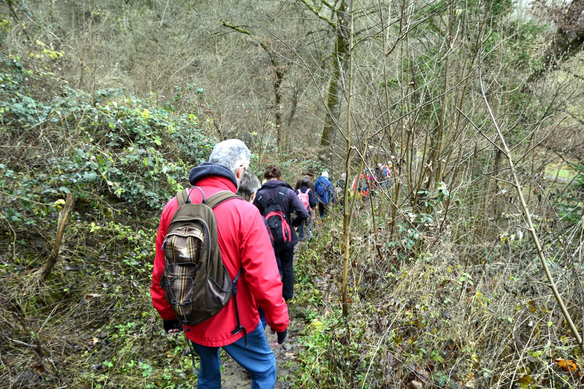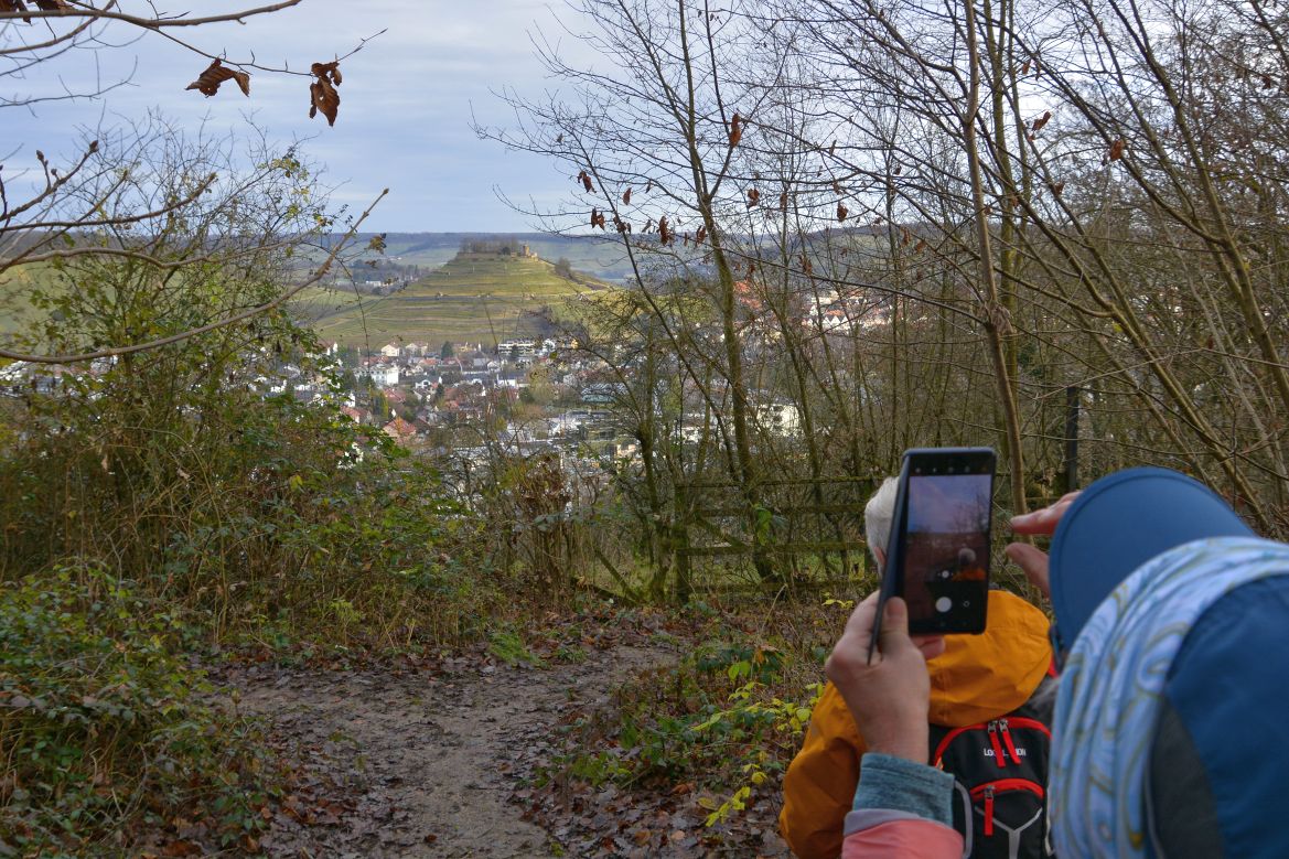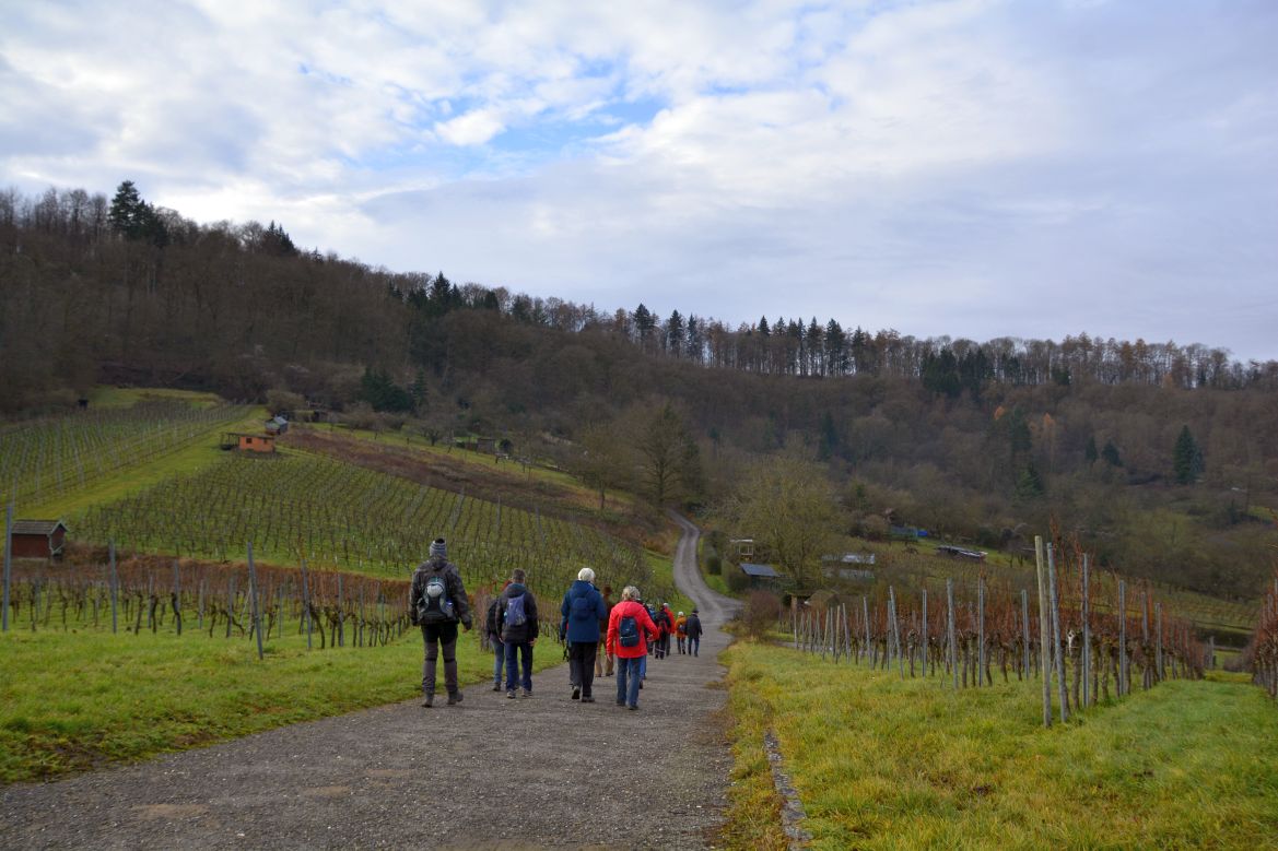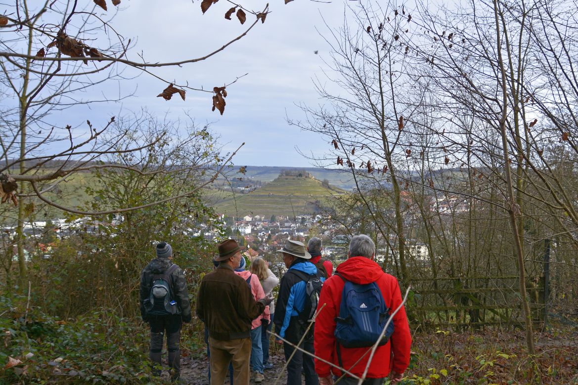 Gewandert wurde natürlich auch. Die schöne, mit einigen Höhenmetern gewürzte Tour führte die 24-köpfige Gruppe über den Paradiesweg zum Advokatenstäffele und auf schmalem, manchmal auch rutschigem Pfad ins Gewann Lindach. Vorbei am Tunneleingang der Bahnlinie Heilbronn – Crailsheim, den viele der auswärtigen Gäste nicht kannten. Der unter Denkmalschutz stehende Tunnel ist 891 m lang, wurde 1862 fertiggestellt und war seinerzeit der längste Eisenbahntunnel Württembergs.