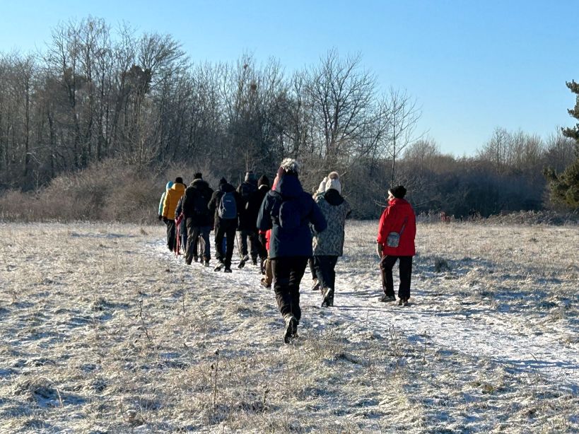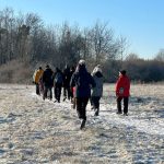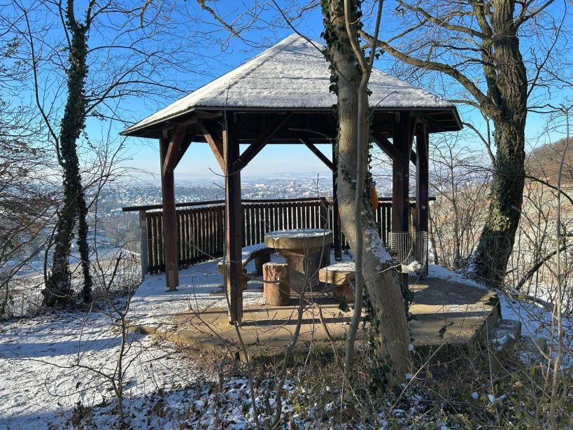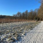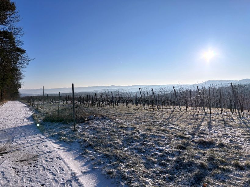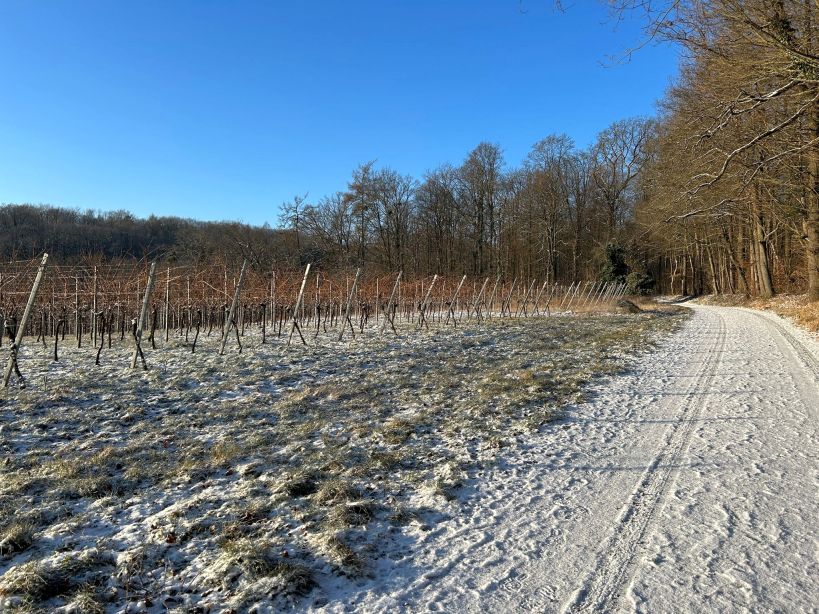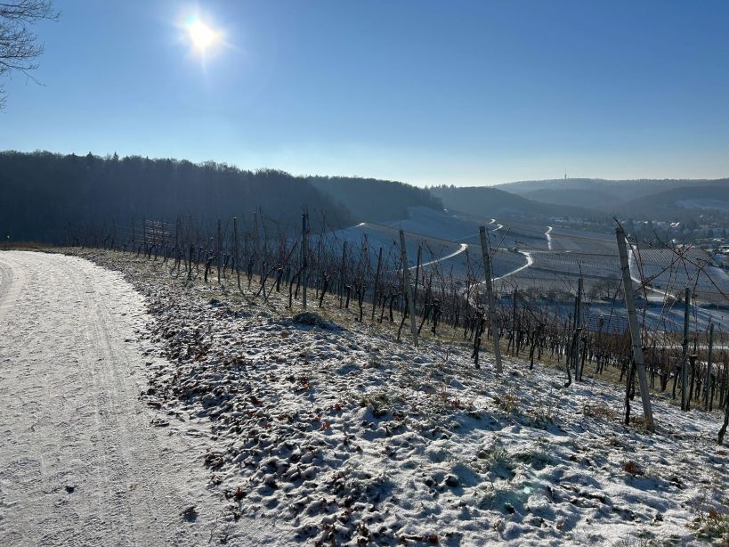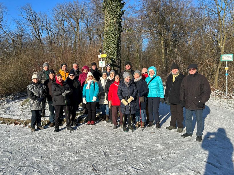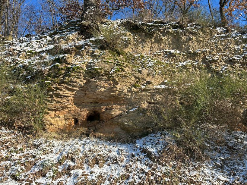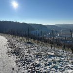 Entlang der Weinberge verlief der Weg dann auf dem Keuperweg zum Schilfsandsteinbruch. Im Winter sind hier die großen Steinwände gut zu sehen. Die Abbruchsteine und Felsbrocken waren auch hier mit Puderzucker geschmückt. Über den kleinen Anstieg der Kirschenallee, wanderte die Gruppe dann auf dem direkten Weg wieder zum Wanderheim. Mit einer Punktlandung um 12: OO Uhr endete nach gut 9 km die erste Kurzwanderung 2026.