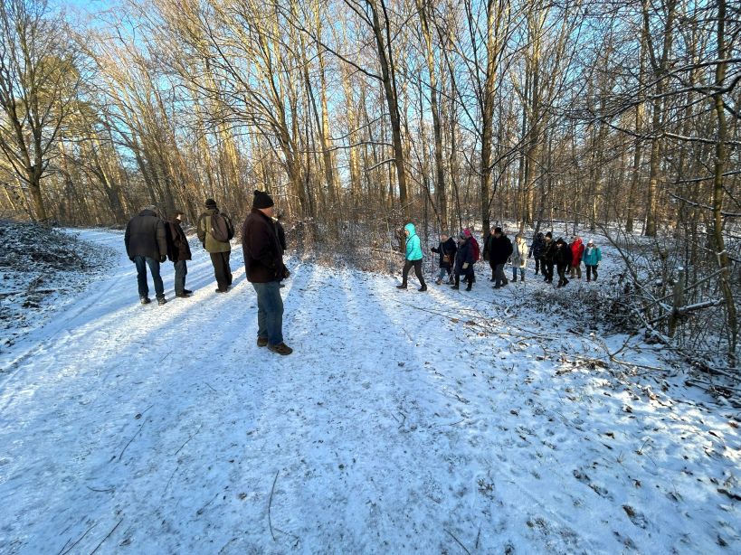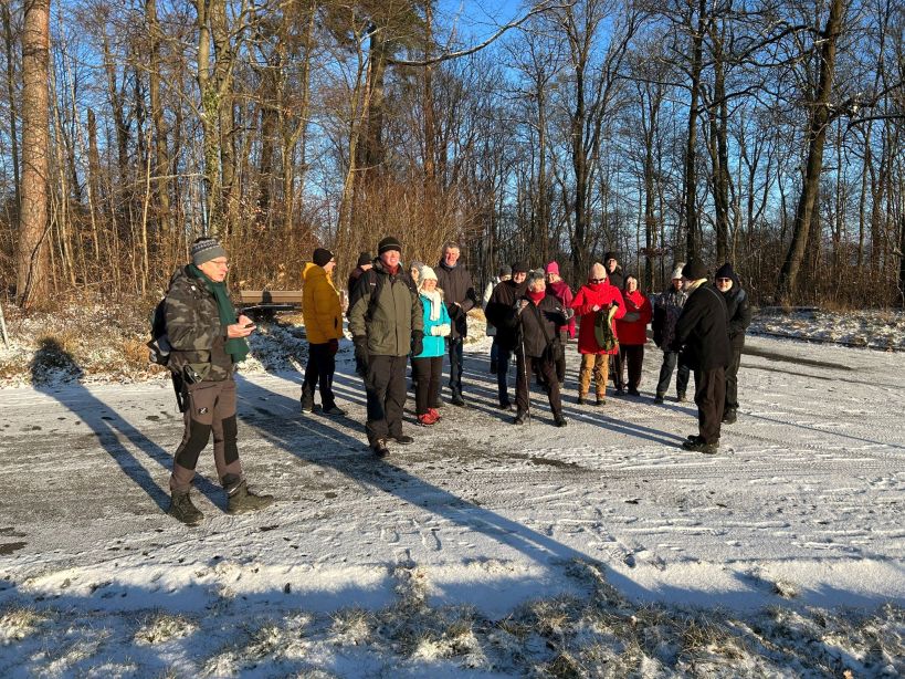 Immer in Richtung Sonne führte Monika Breusch die Gäste zur Waldheide , die wie meistens ein magisches Licht hatte. Vorbei am Schafstall führte der Weg dann entlang der Straße zum Galgenbergweg und weiter zur Kreuzung im Gewann Tunnel. Hier stellten sich die Gäste für das obligatorische Gruppenbild in die Sonne.