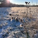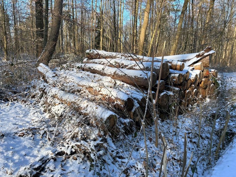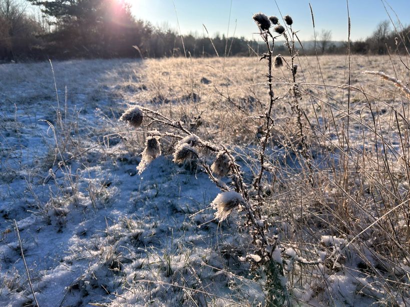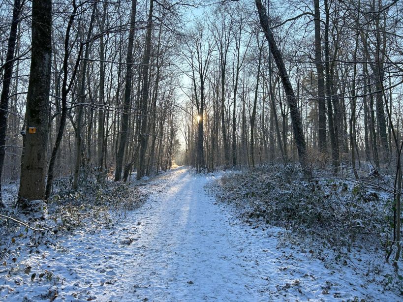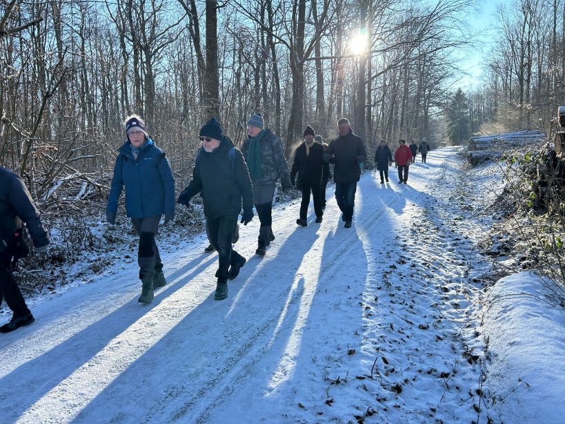 Das heutige Hoch bescherte den Wanderern am Start noch knackig kalte Temperaturen. Im Osten kämpfte sich die Sonne durch die Hochnebel, und sorgte aber recht bald für einen strahlend blauen Himmel. Rechts und links der Wege hatte der Schnee die Bäume und Sträucher mit Puderzucker überzogen . Die Wege schlängelten sich wie weiße Bänder  in Richtung Waldheide.